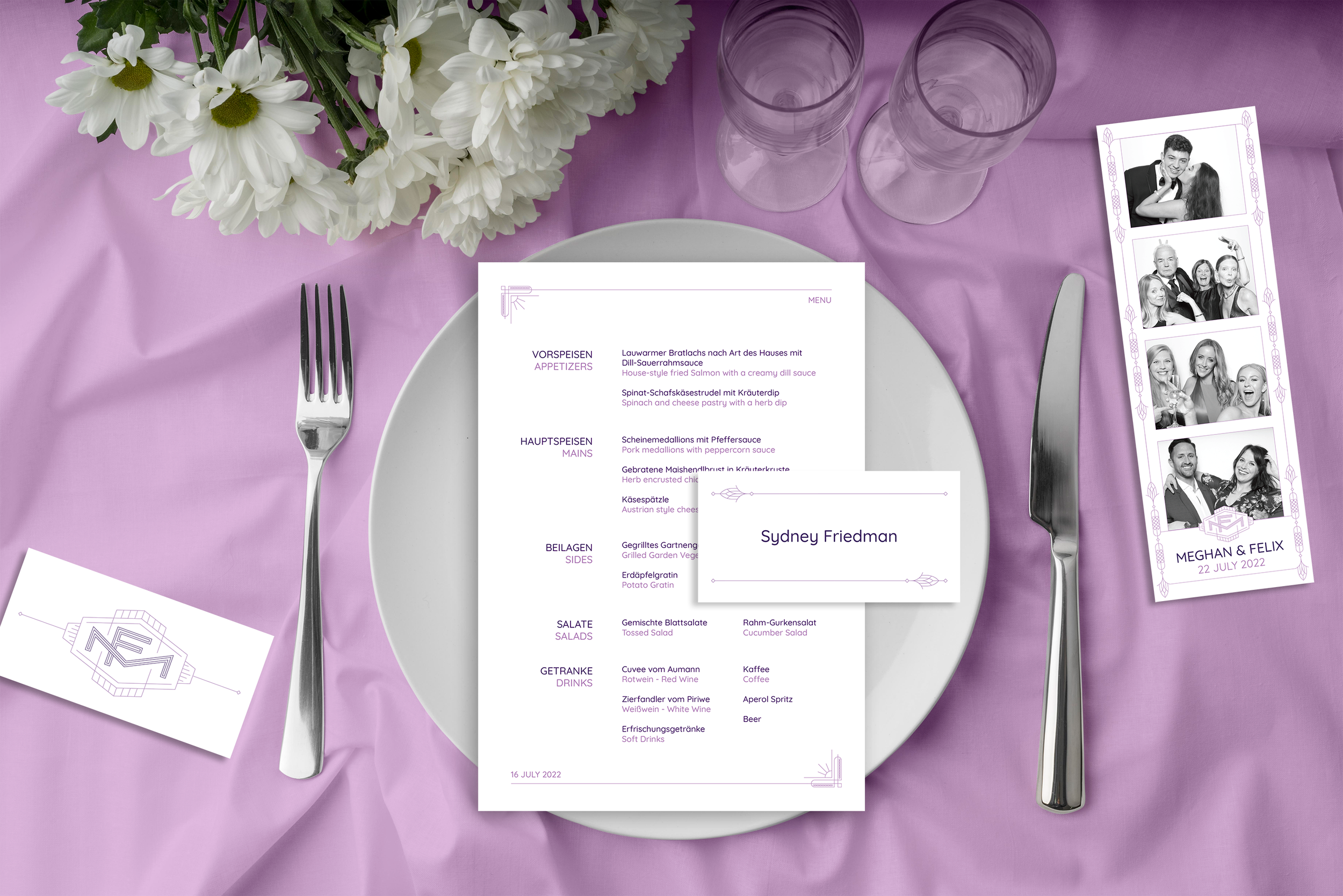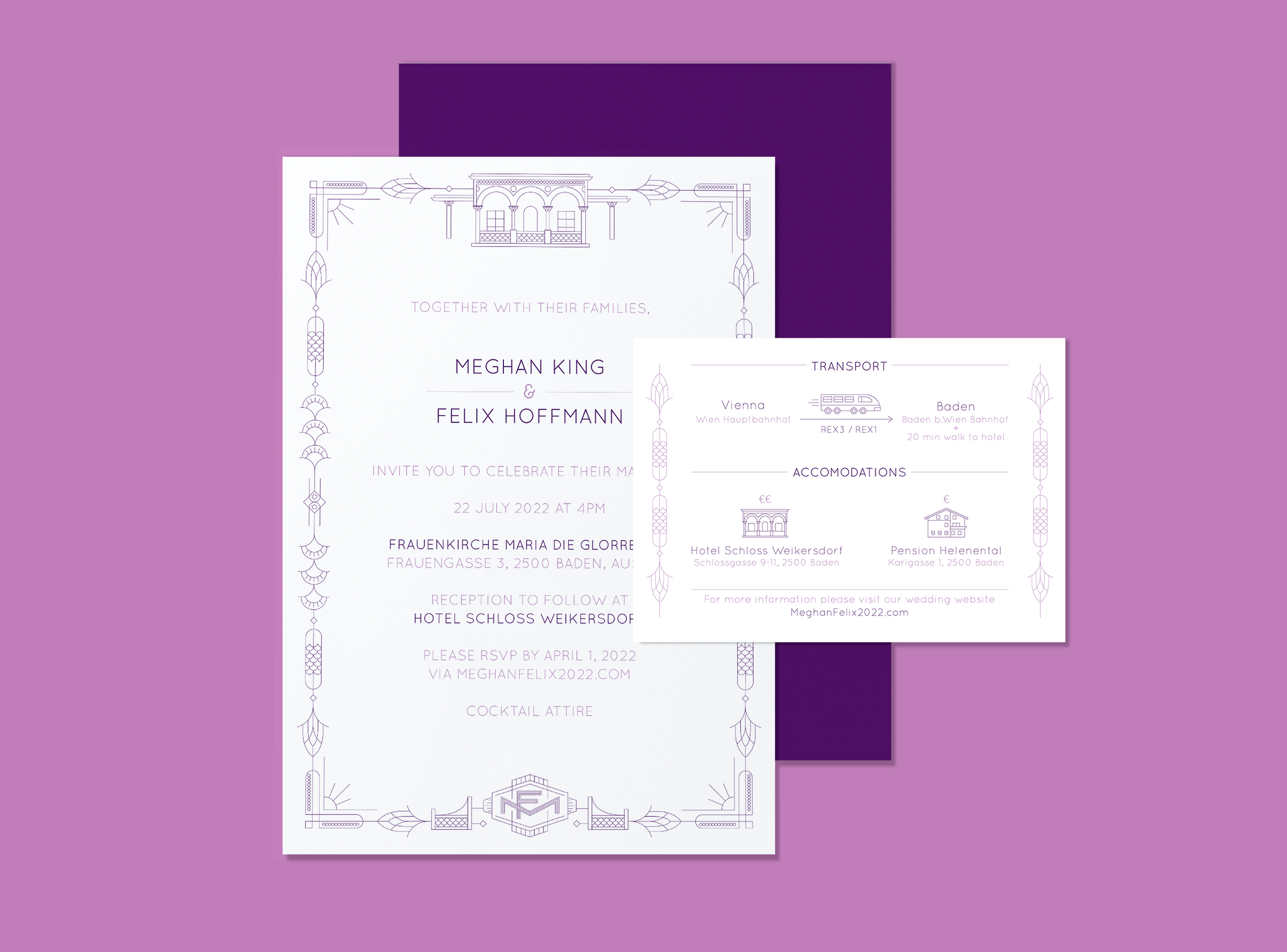 I designed a custom wedding invitation for an international wedding of a close friend. The artwork was inspired by the bride's art deco dress, as well as the Austrian venue. Due to the guest list, the invitation / information cards had to work in English, German, and Hungarian. (names & dates have been changed)